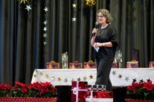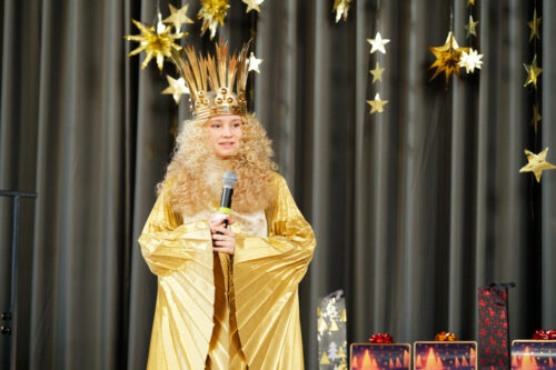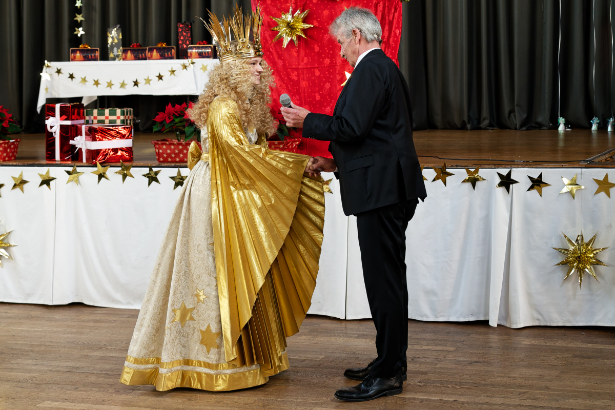 Im Anschluss beantwortete das Christkind überaus redegewandt und selbstsicher noch die Fragen, die unser Ehrenvorsitzender, Gerhard Danzl an den „himmlischen Gast“ richtete. So erfuhren wir, dass es in diesem Jahr zusammen etwa 170 Termine wie den heutigen wahrzunehmen hat, dass ihre Krone ziemlich schwer sei, und dass ihr ihre Aufgabe Freude bereite. Die Schule leide nicht sehr unter ihrer Christkindrolle, betonte Nora Falk, sie sei nun in der 11. Klasse und bereite sich langsam auf das Abitur vor. „In der 11. Klasse ist kein allzu umfangreicher Lehrstoff zu bewältigen und versäumte Arbeiten kann ich nachholen.“